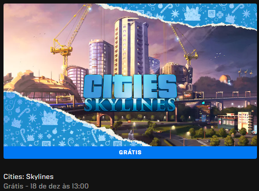 A partir do dia 17/12 a Epic Games estará disponibilizando jogos para PC de graça, um por dia, durante 15 dias. Para começar com o pé direito, temos o jogo Cities: Skylines, que ficará disponível de graça até às 13h do dia seguinte. Segue a lista atualizada diariamente com os jogos e seus links, dessa promoção: