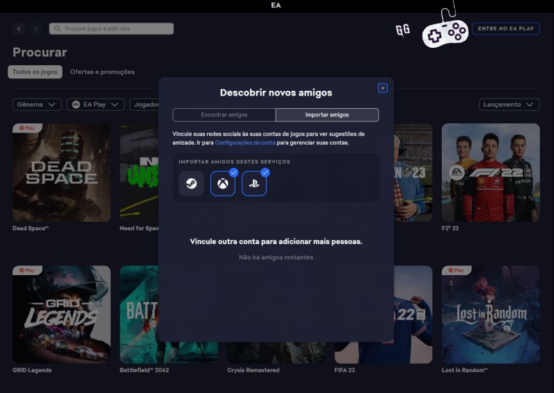 • Possibilidade de criar uma lista de amigos na própria EA app, conectando jogadores de outras plataformas. Assim rola, por exemplo, adicionar players da Steam, Xbox e Playstation, entre outros. Isso dá a possibilidade de visualizar o que a galera está jogando e então acessar esses títulos para jogar junto com o pessoal.