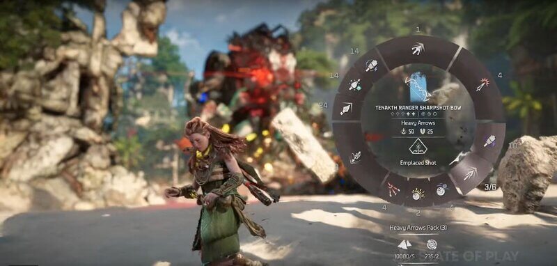 - Novas mecânicas de exploração e combate: o combate e exploração tiveram algumas adições interessantes. Entre elas está o Lança-Gancho, que garante que Aloy acesse áreas mais afastadas, além de poder ser utilizado em combate. Entre os novos equipamentos também está uma Planador, que ajuda a amenizar a queda de locais mais altos. Este é similar à mecânica de Zelda: Breath of the Wild.