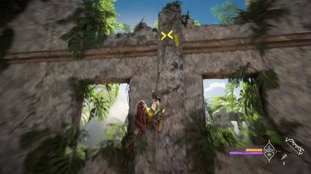 Um dos novos equipamentos que vai estar à disposição de Aloy é o gancho que permite que ela se agarre em lugares específicos. Isso possibilita alternativas interessantes para se mover rapidamente durante o combate.