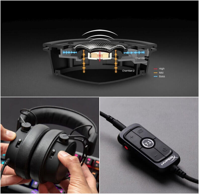 Agora o principal destaque do HyperX Cloud Alpha S é o som Surround 7.1, que gera um efeito tridimensional e proporciona uma maior imersão no jogo. Porém, para usufruir deste recurso e para obter toda a qualidade de som mencionada anteriormente, é necessário que o headset esteja conectado à placa DSP. Através dela é possível ativar o recurso, silenciar o microfone, ajustar o volume e o equilíbrio do áudio do jogo e do chat, tudo isso de forma prática sem precisar sair do game.