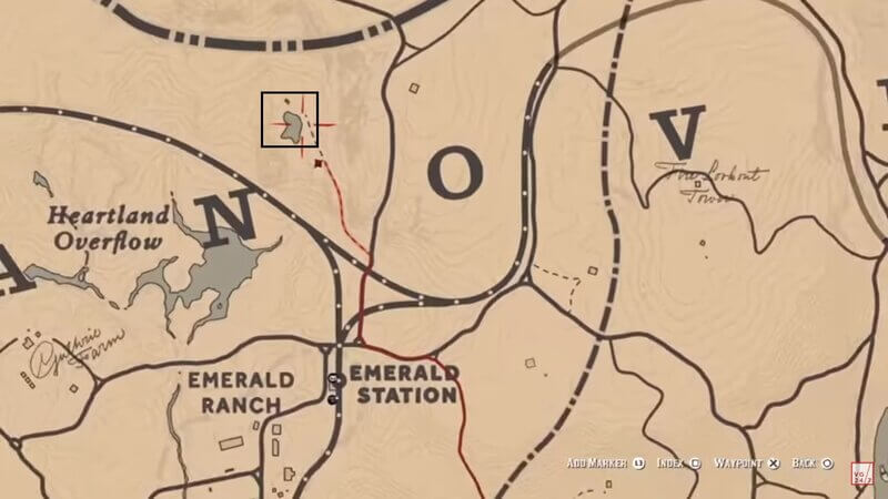 Em Emerald Ranch, na área selvagem ao norte do mapa, é possível encontrar um OVNI. Para que isso ocorra, se dirija ao casebre chamado Hani’s Bethel, confira o quadrado na imagem abaixo e use a ferramenta rdr2map para facilitar sua busca.