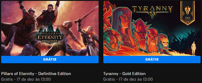 Até o dia 17/12, a Epic Games estará disponibilizando dois jogos gratuitamente em seu site, os jogos são: Pillars of Eternity – Definitive Edition e Tyranny – Gold Edition.