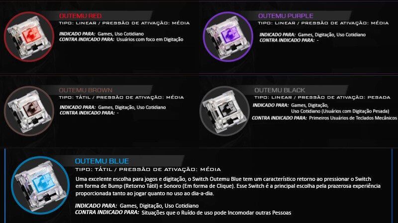 Basicamente, esse tipo de teclado mecânico tem duas funções: a de responsividade e também a de conforto. Com base nessas informações, cada Switch tem características distintas, que são representadas por cores e configurações específicas.
