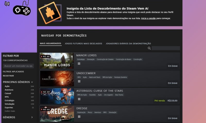No site estão as lives disponíveis e um banner informando sobre a lista de descobrimento da Steam. Abaixo dele você irá encontrar a lista personalizada de demonstrações populares. Lá vários títulos ficaram visíveis, e é só escolher a demonstração que quer experimentar e jogá-la na mesma hora.