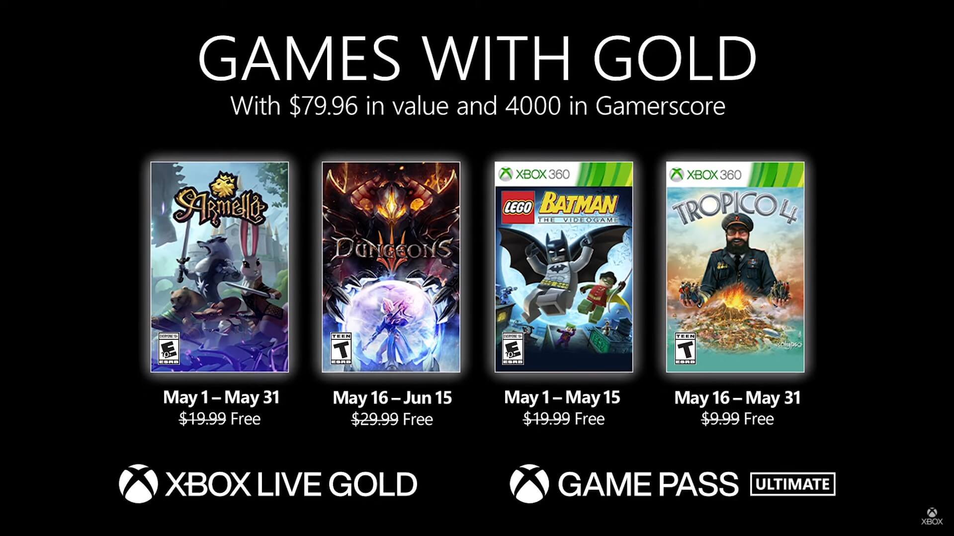 Já foram relevados quais serão os jogos que ficarão gratuitos para o mês de Maio, aos assinantes do Xbox Live Gold e Game Pass. Sem mais delongas seguem os jogos e datas: Armello (Xbox One | Series) – 1º a 31 de maio Dungeons 3 (Xbox One | Series) –