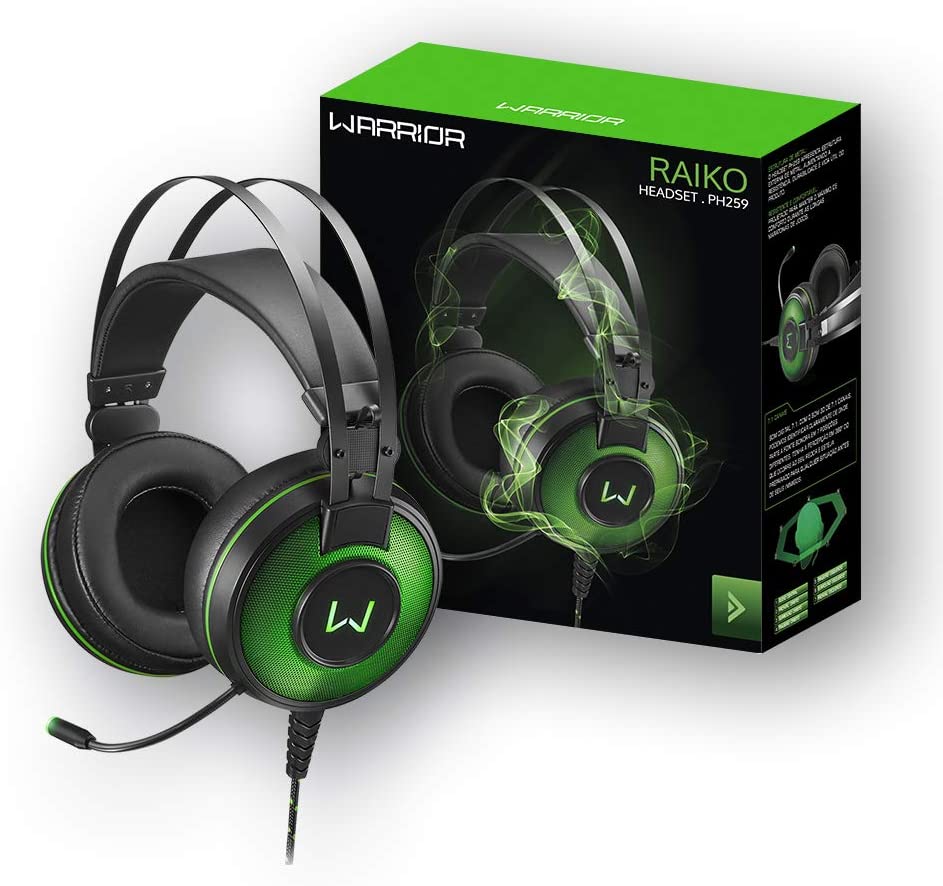 O Headset Gamer Warrior Raiko apresenta estrutura externa de metal, aumentando a resistência, durabilidade e vida útil do produto. Almofadas ultra macias com couro em PU ultra macio resultando em mais conforto para seu jogo. Headset com luz de LED verde decorativa. E o cabo de nylon 2.1 metros, promove maior durabilidade e resistência ao seu Headset.